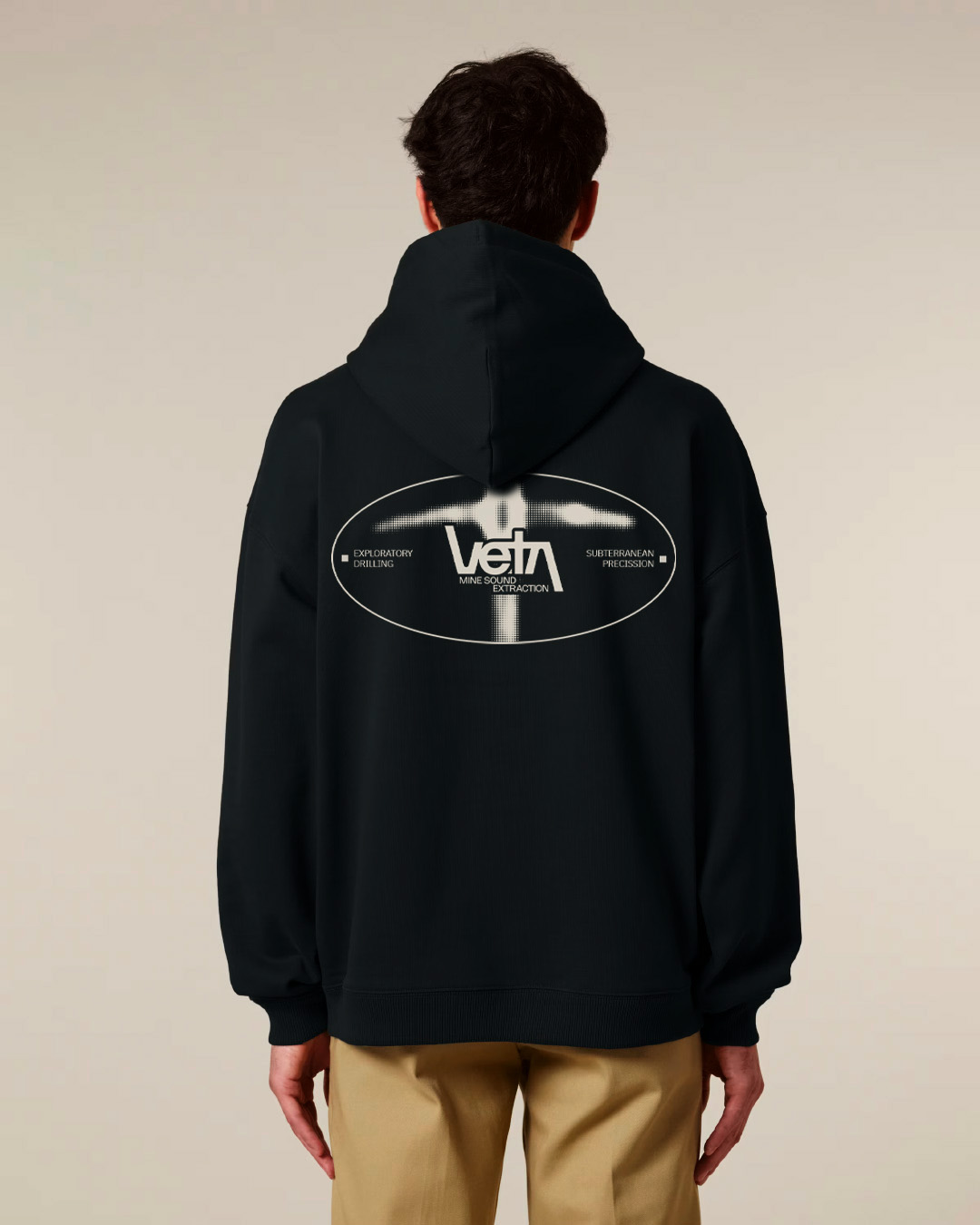 Manga montada con hombro caído. Borde acanalado en puños y parte inferior. Secciones laterales acanaladas. Bolsillo canguro. Capucha forrada con material principal. Banda de protección en el interior del cuello. Cortado y cosido.